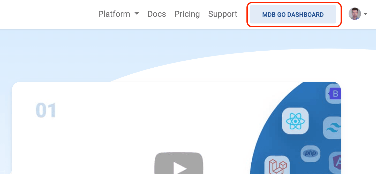 The MDB GO DASHBOARD button will then appear in the navbar in the upper right corner. Click on it to go to the MDB GO administration panel.