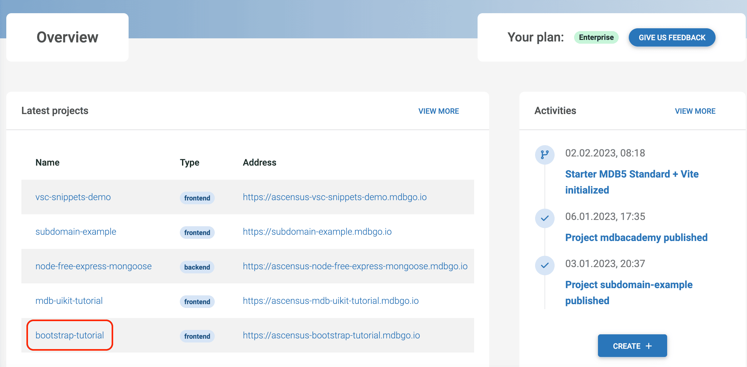 In the "Latest projects" section you will see your recently published project. If you click on its name, you will be taken to the control panel for that particular project.
