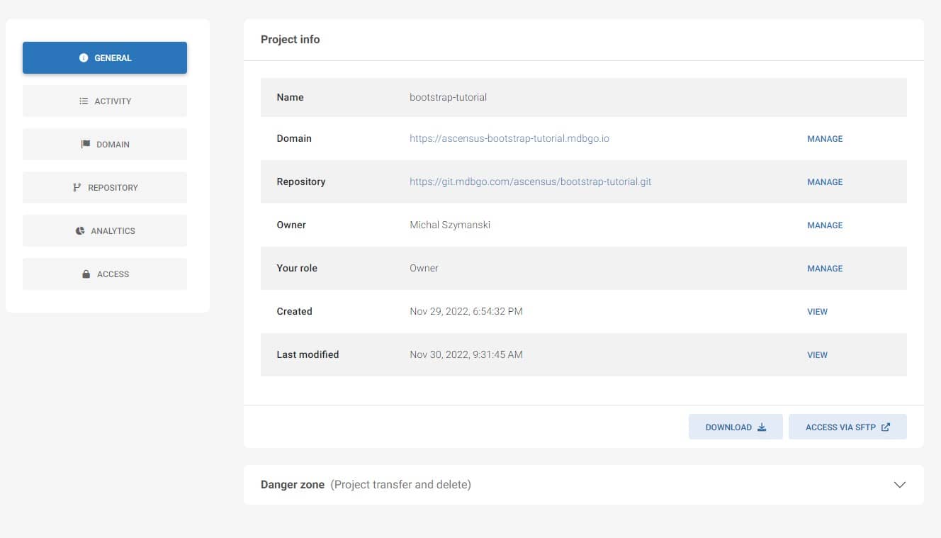 Here you can manage your project - grant access to it, rename it, manage the repository, set a custom domain and much more. You also have access to the analytics panel.