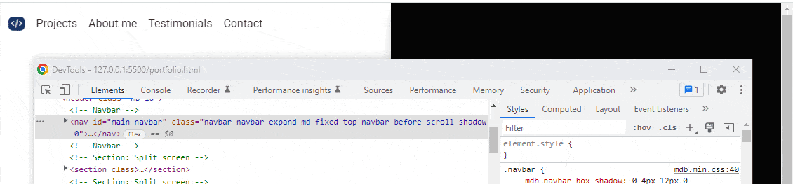 Next, add some CSS code that will make the navbar-after-scroll class (the class that our JavaScript adds to the navbar after scrolling) make the navbar red.