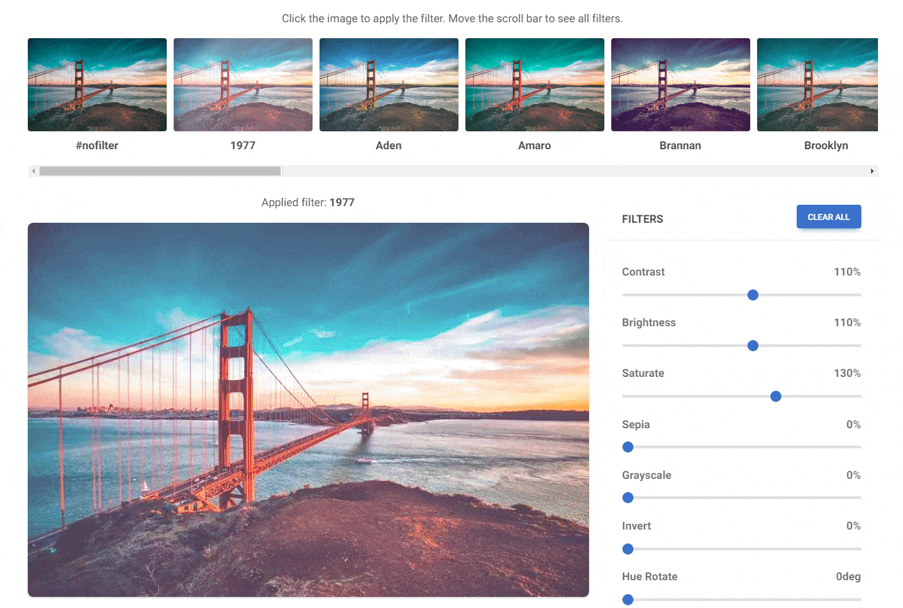 At MDB, we have created a CSS filter generator that allows you to recreate the famous Instagram filters or create your own filters and then turn them into CSS code that you can add directly to your website.