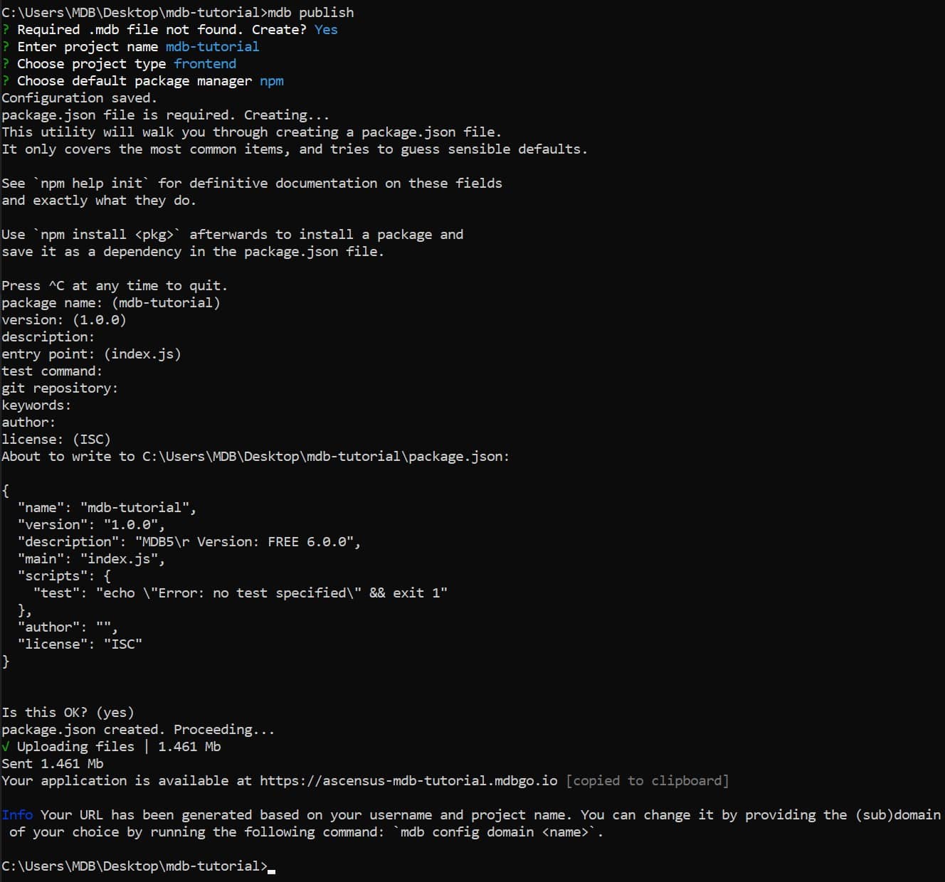 1. In the terminal, type mdb publish command and press enter. You will see the message: