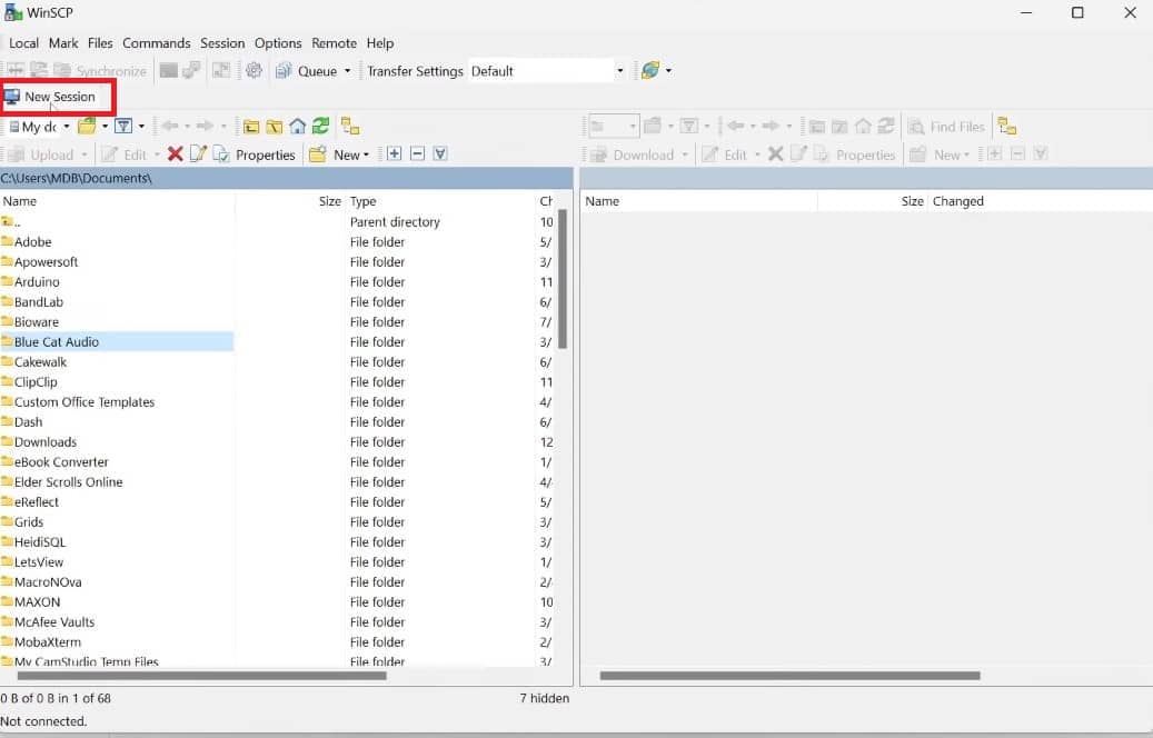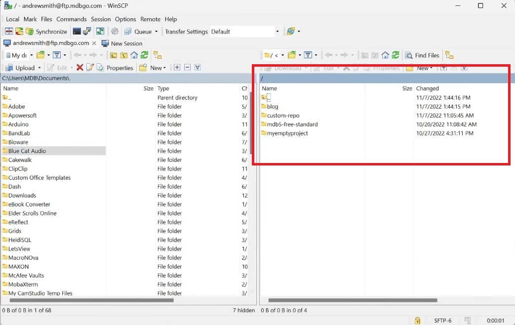 The FTP client will start connecting to the server and after a while you will see the folders of all your projects published on MDB GO in the right column.