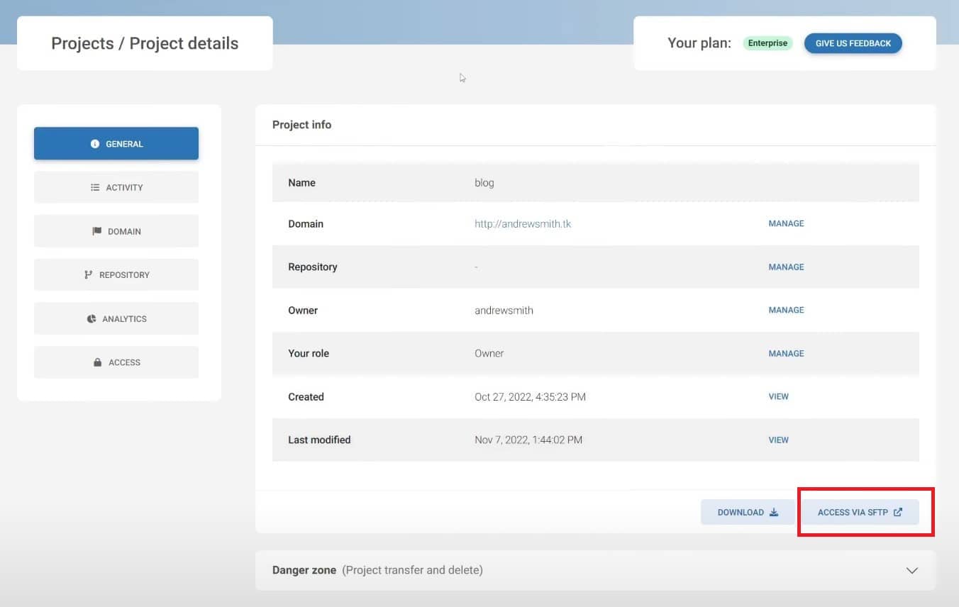 In the MDB GO dashboard, click any project, and then in the General tab, click the Access via SFTP button.