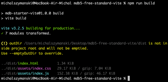 The Vite MDB launcher contains a ready-to-use configuration for PurgeCSS, so all we have to do is run the appropriate command in the terminal, and the rest of the magic will happen behind the scenes.