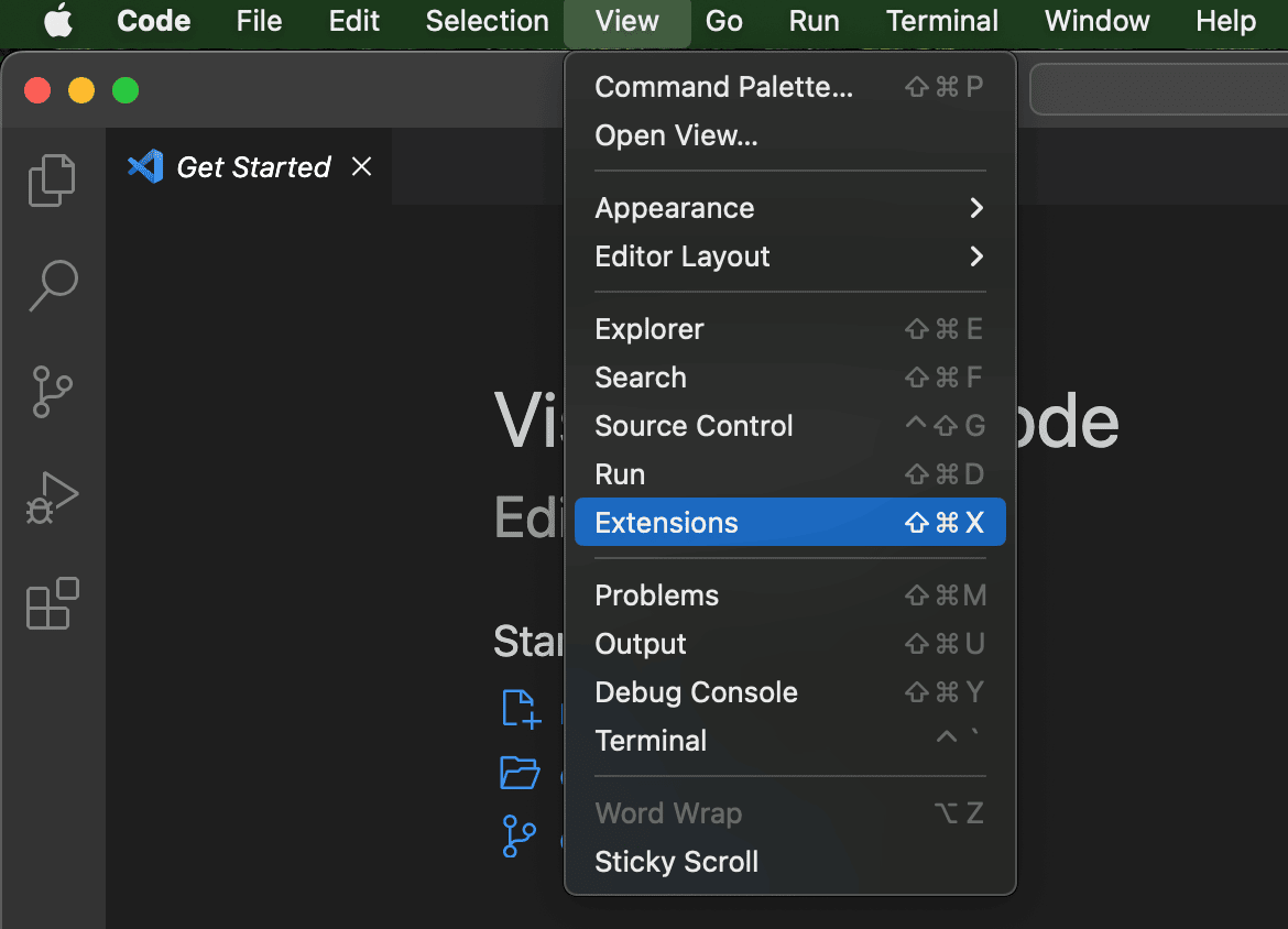 Launch Visual Studio Code and in the top menu click View and then Extensions™: