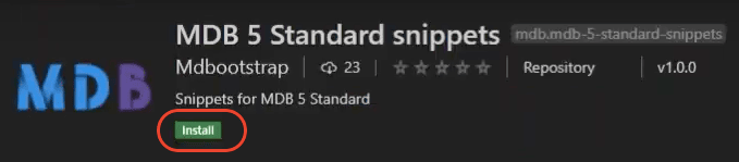 Then in the search box in the upper left corner, type "MDB 5 Standard snippets" and select the official extension, where the author is MDBootstrap.